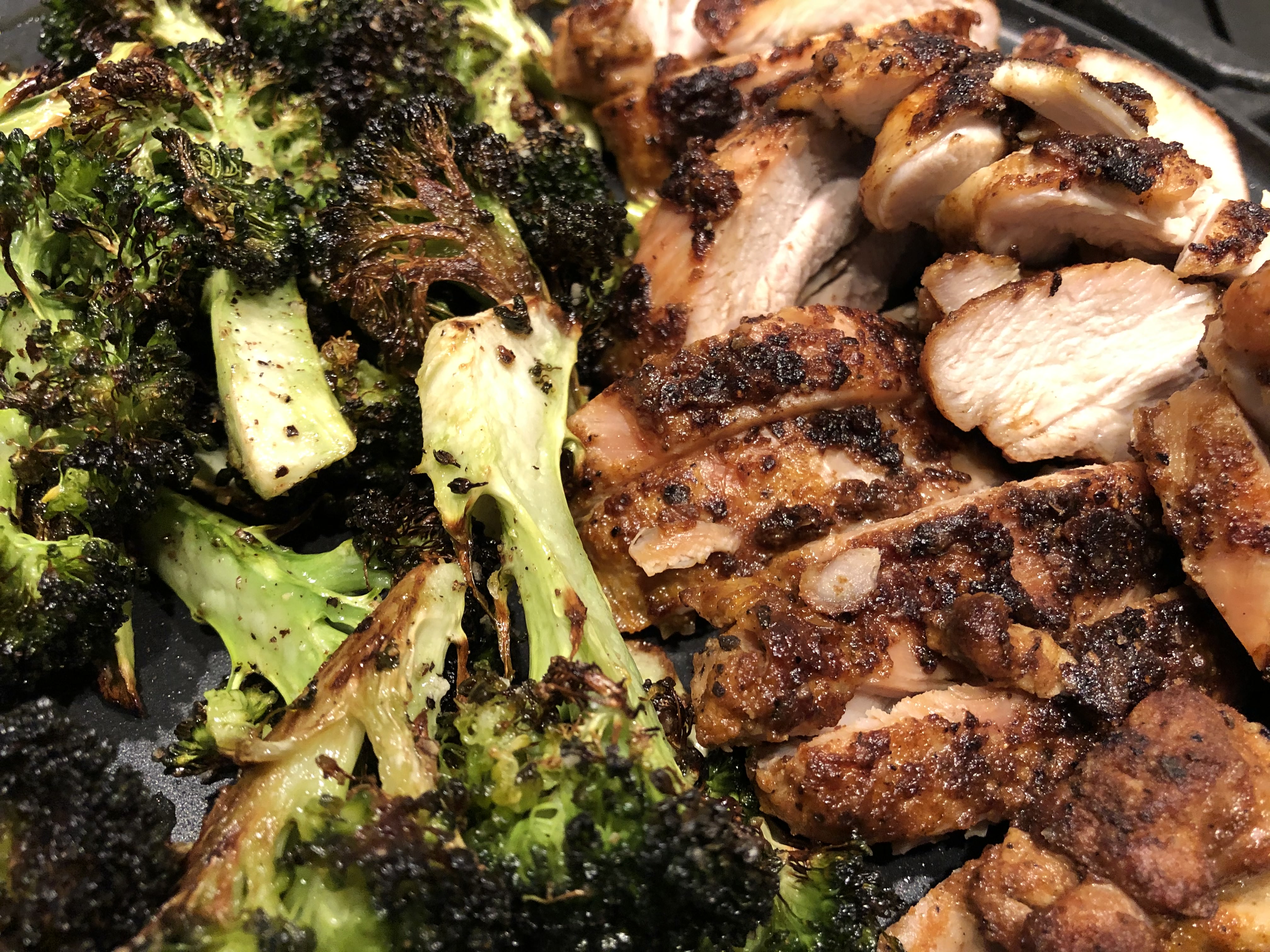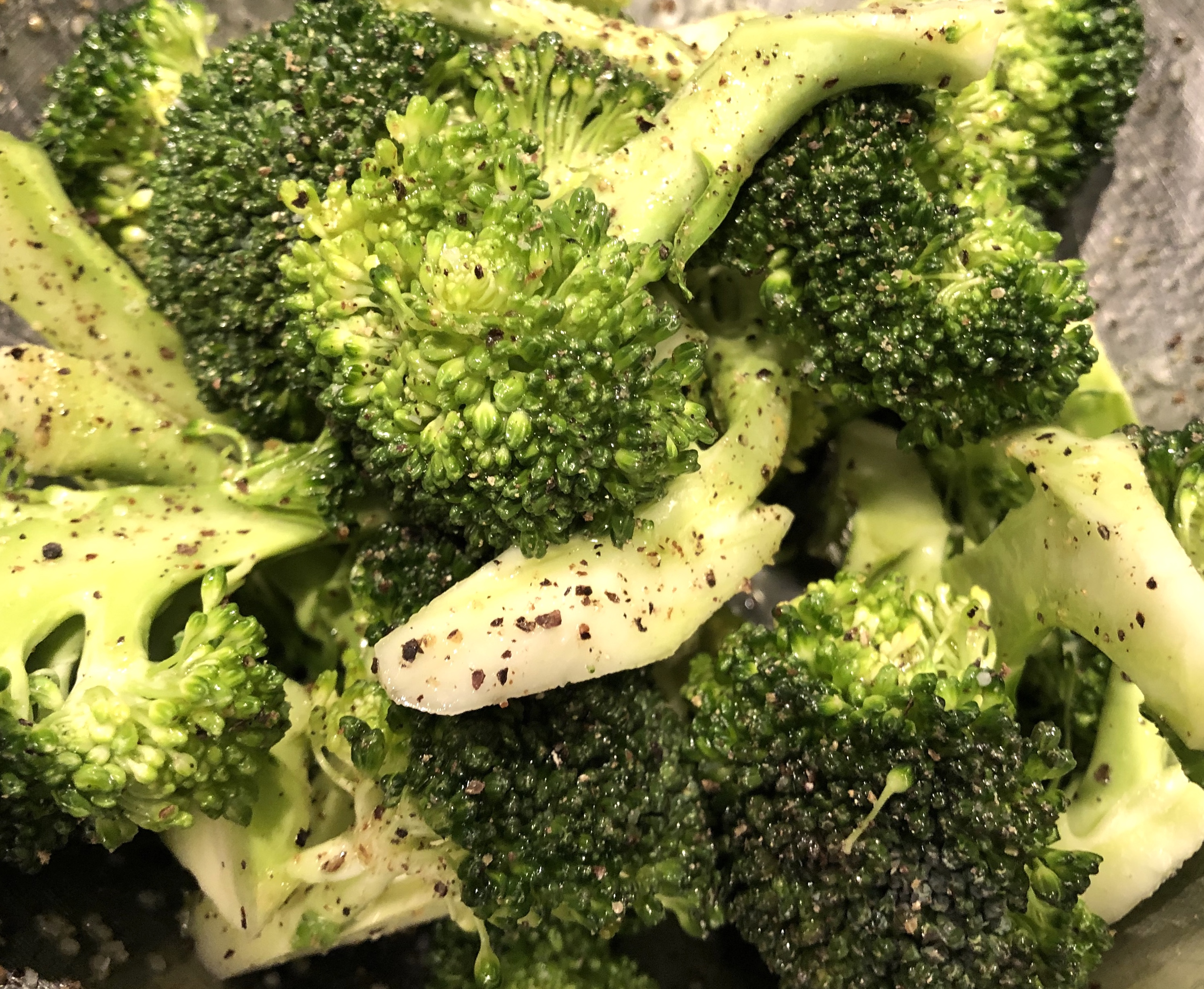 Cut up broccoli into florets. Toss with the oil that you cooked the garlic in, along with the salt and pepper. Place in some sort of pan that allows space. Cook at 450 degrees until crispy.