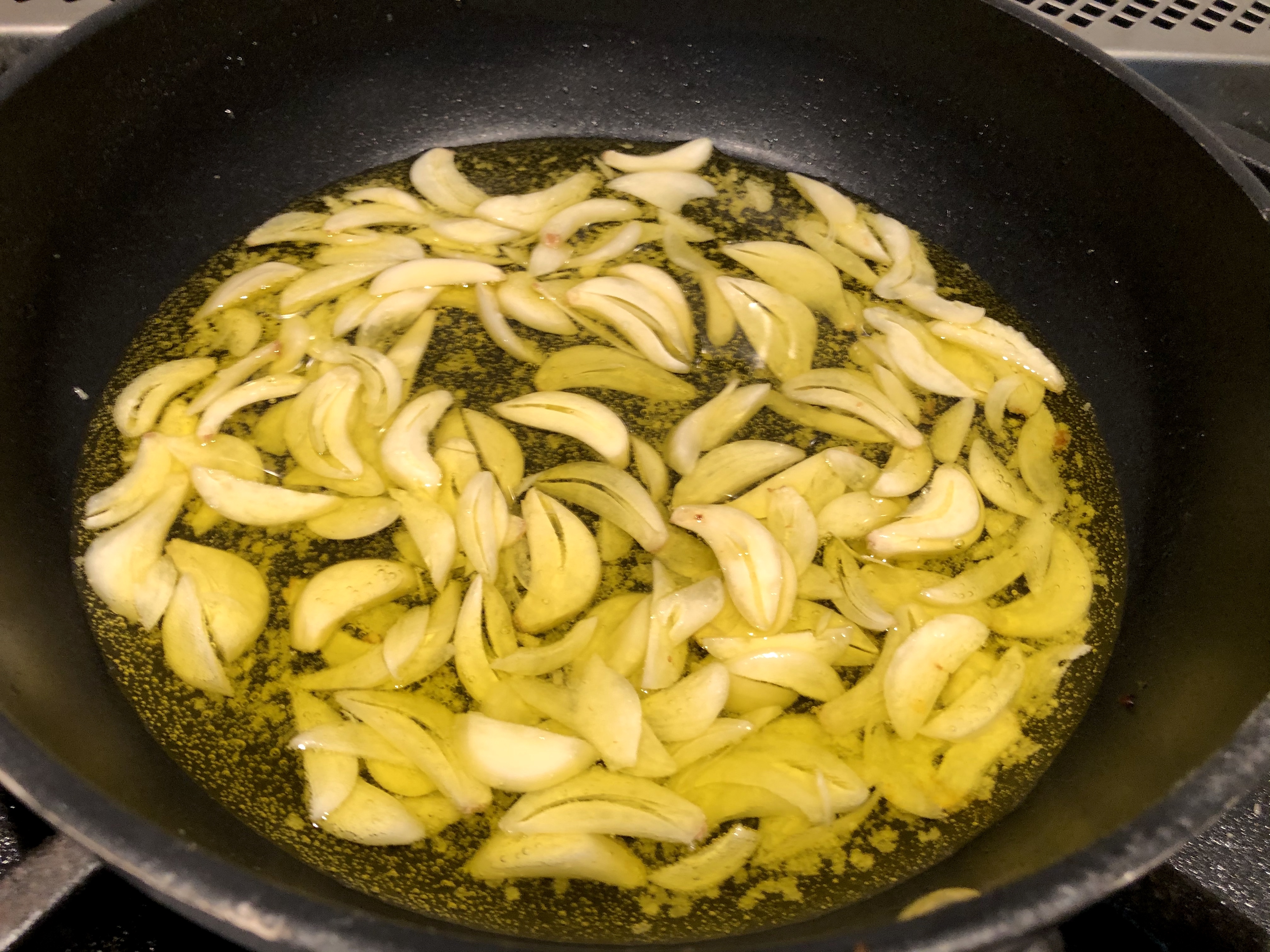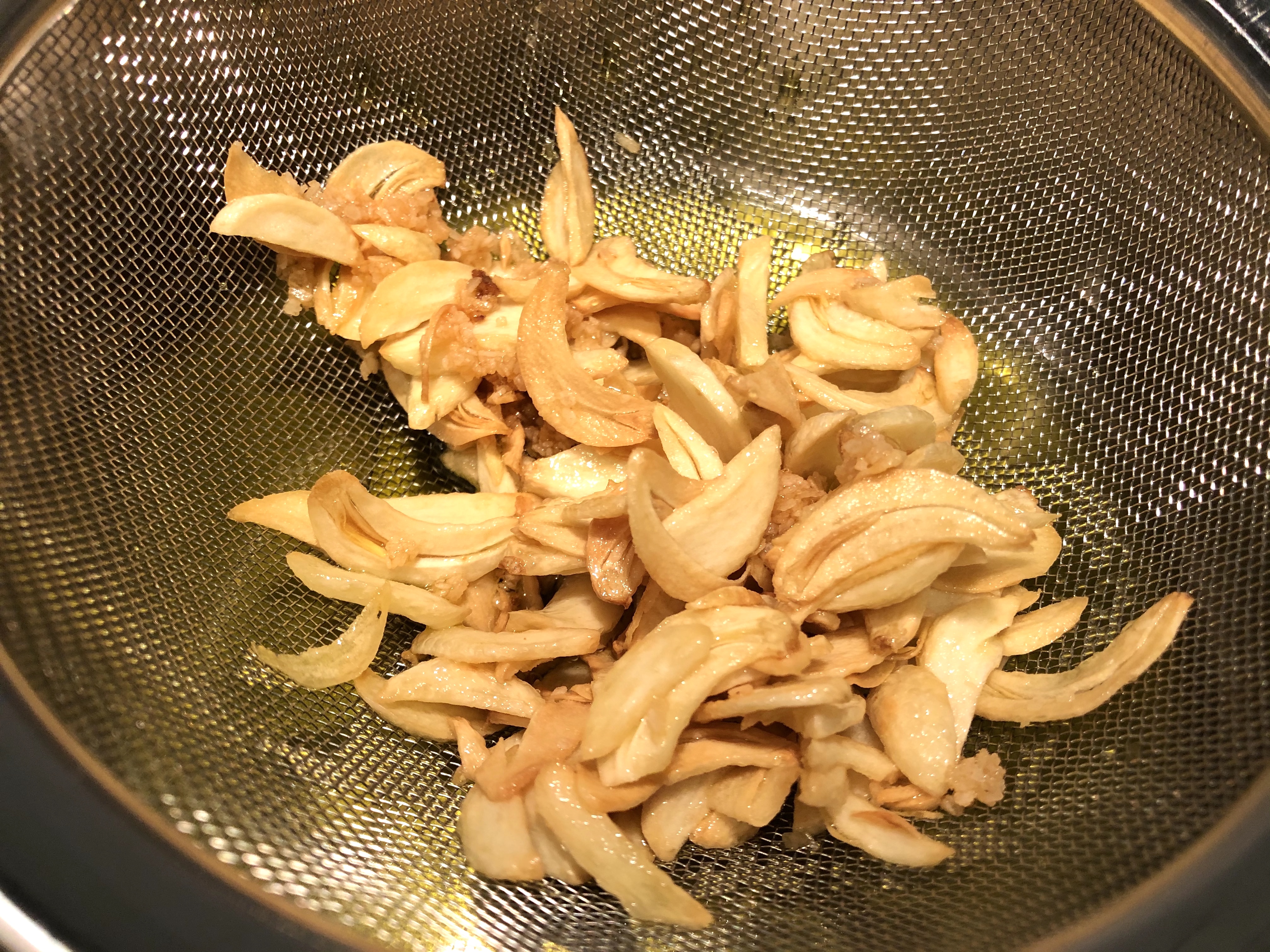 Sliver the garlic as thin as you can get it, and add to the olive oil. Season with a quarter of the salt. Cook low and slow until golden brown. Once golden, strain out garlic and reserve for garnish later.