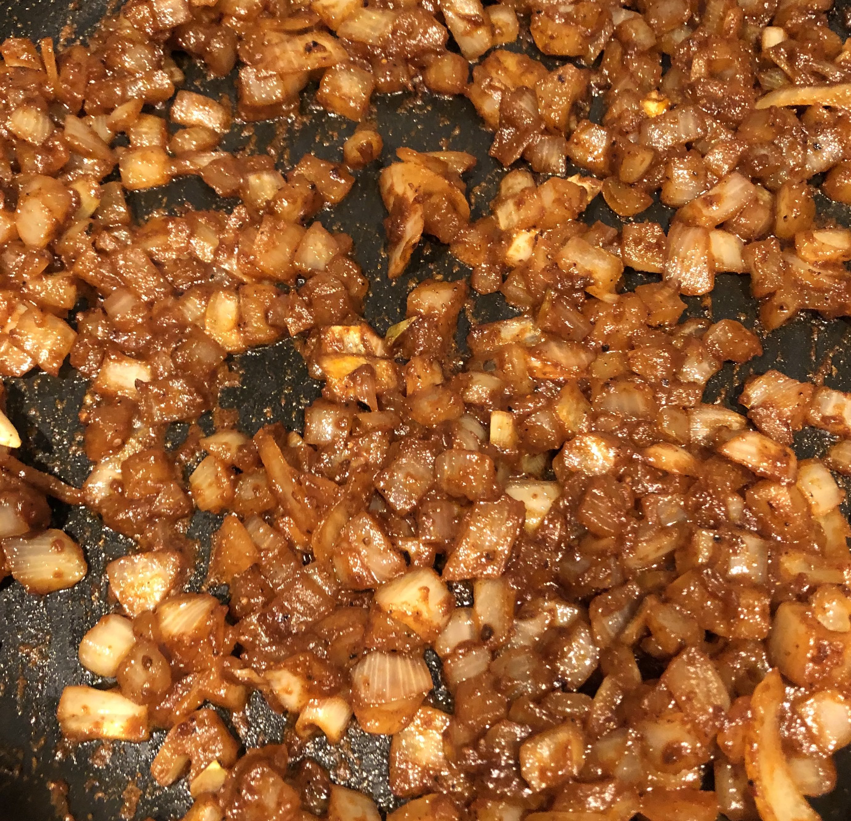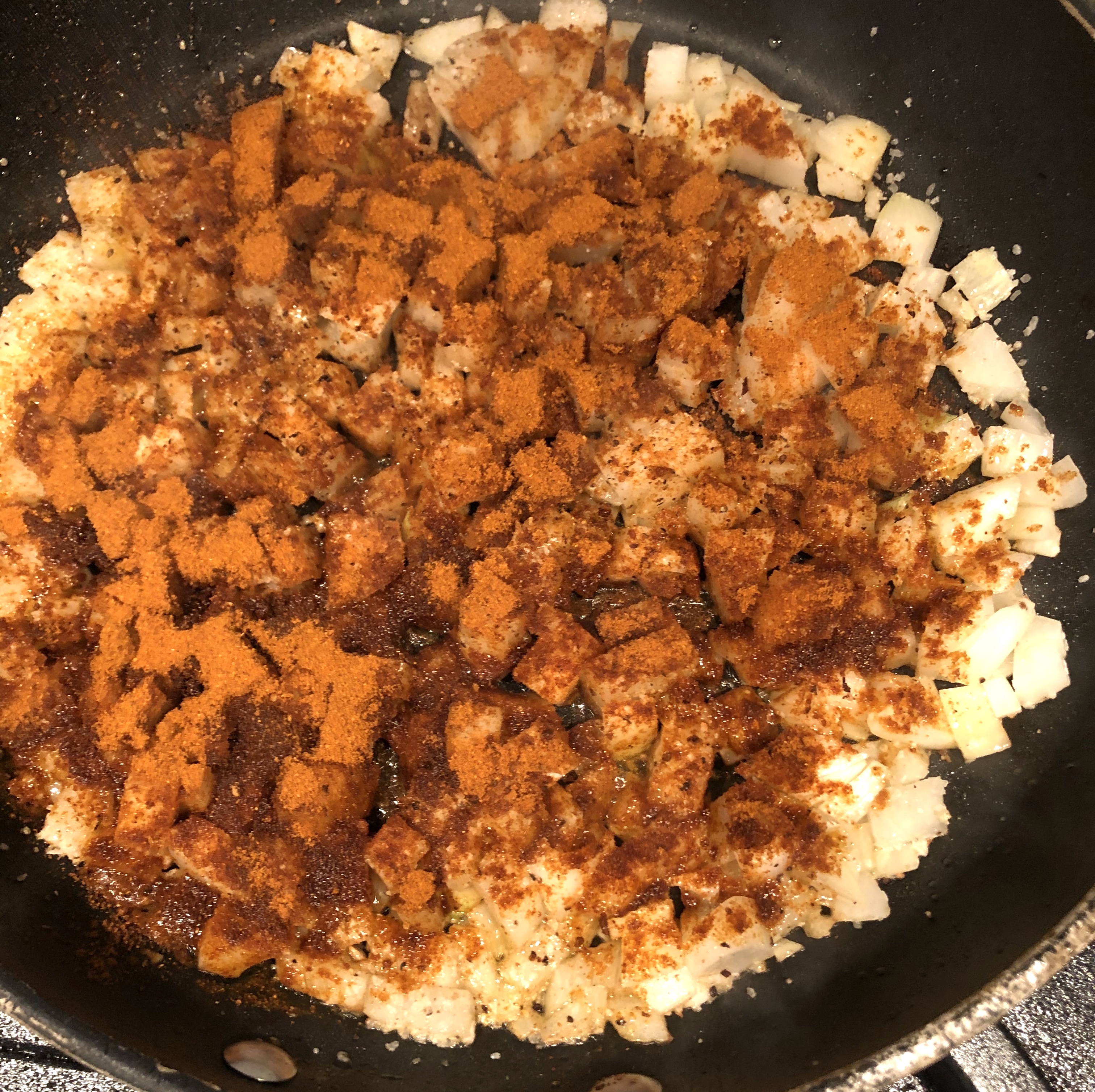 Take the pan that you had just cooked the chicken in and dab it clean with a paper towel to get the burnt spices and left over oil out of the pan. Add new oil. Now sweat out onions with Paprika, Salt and Pepper until tender, translucent and sweet.