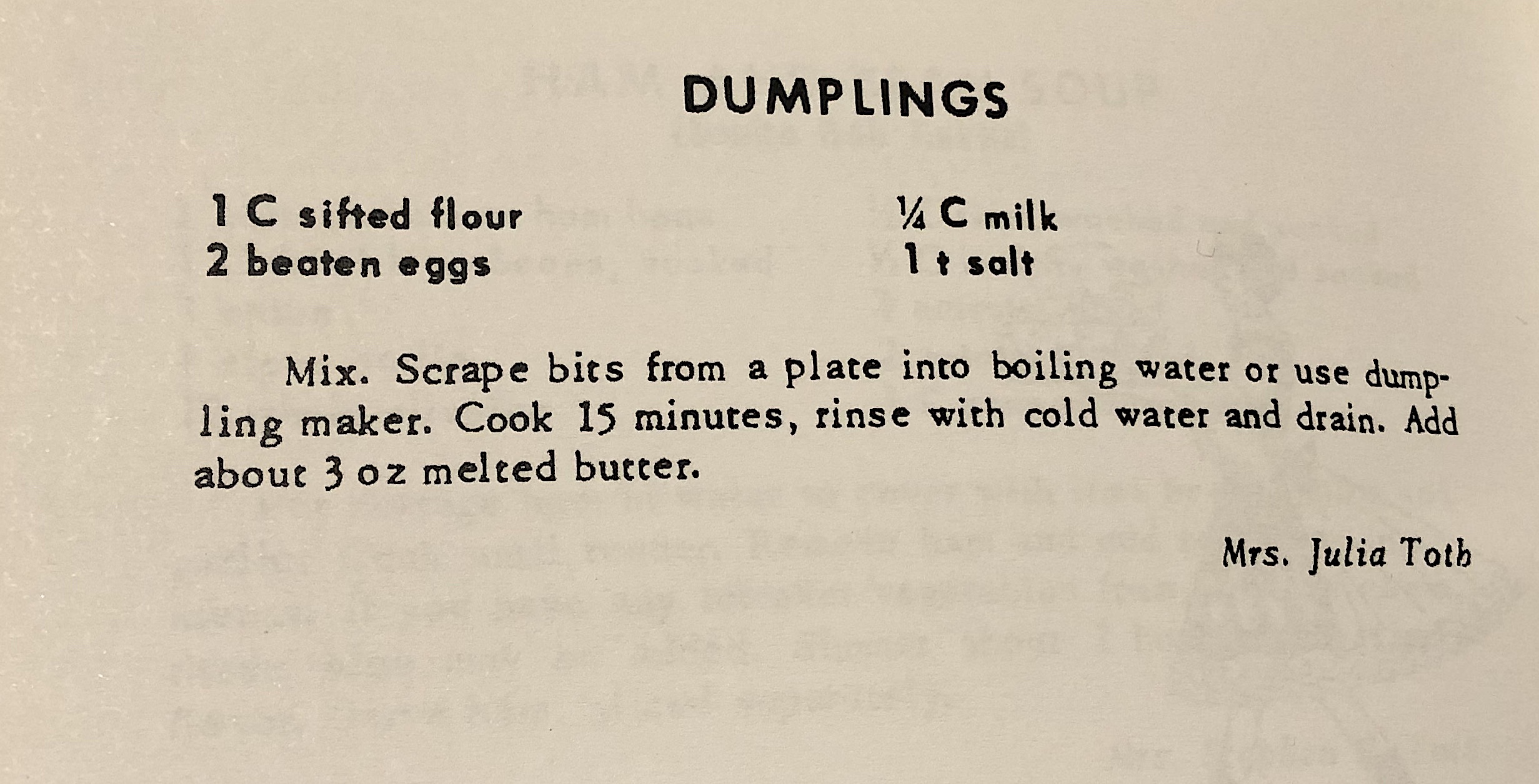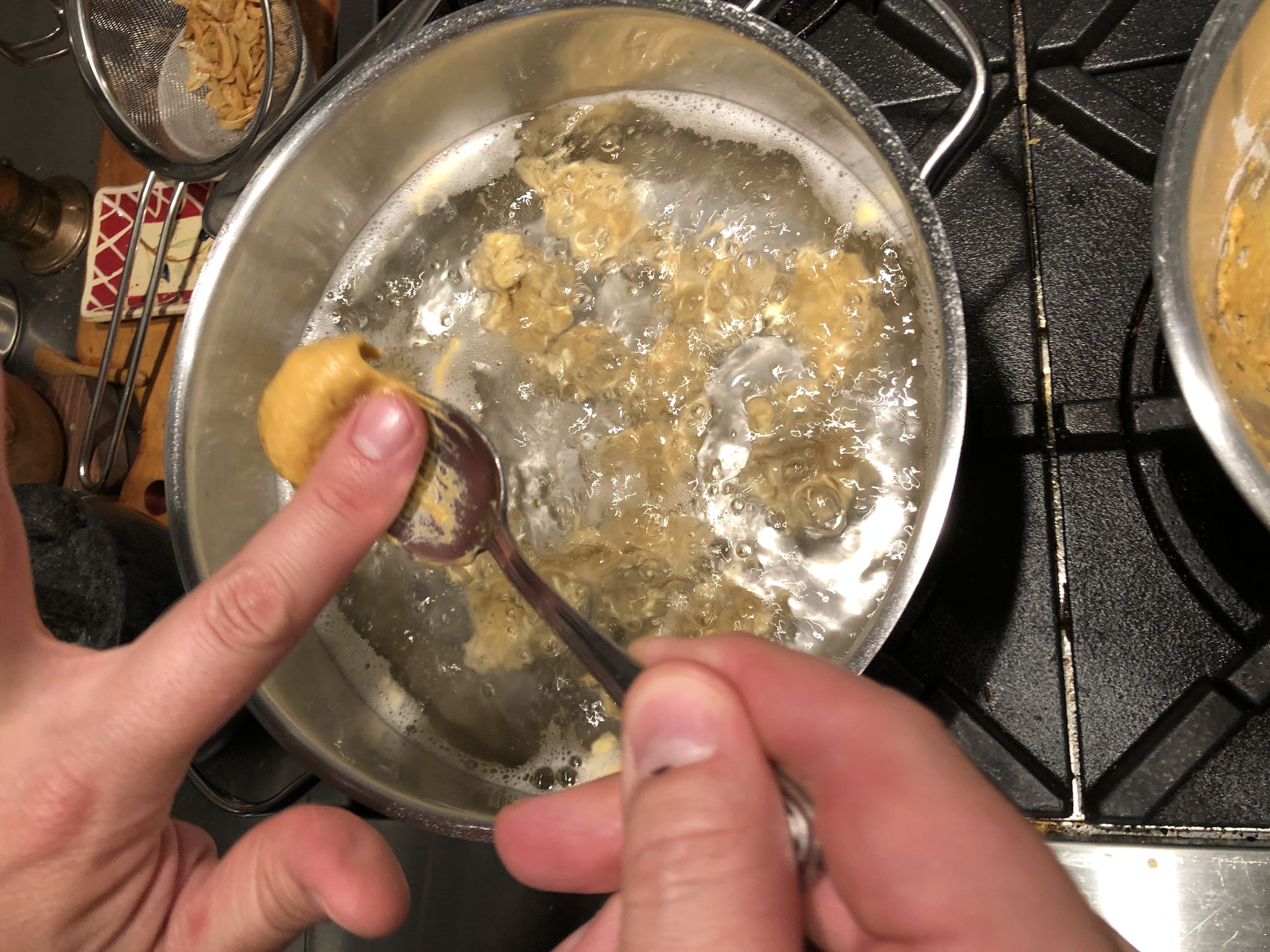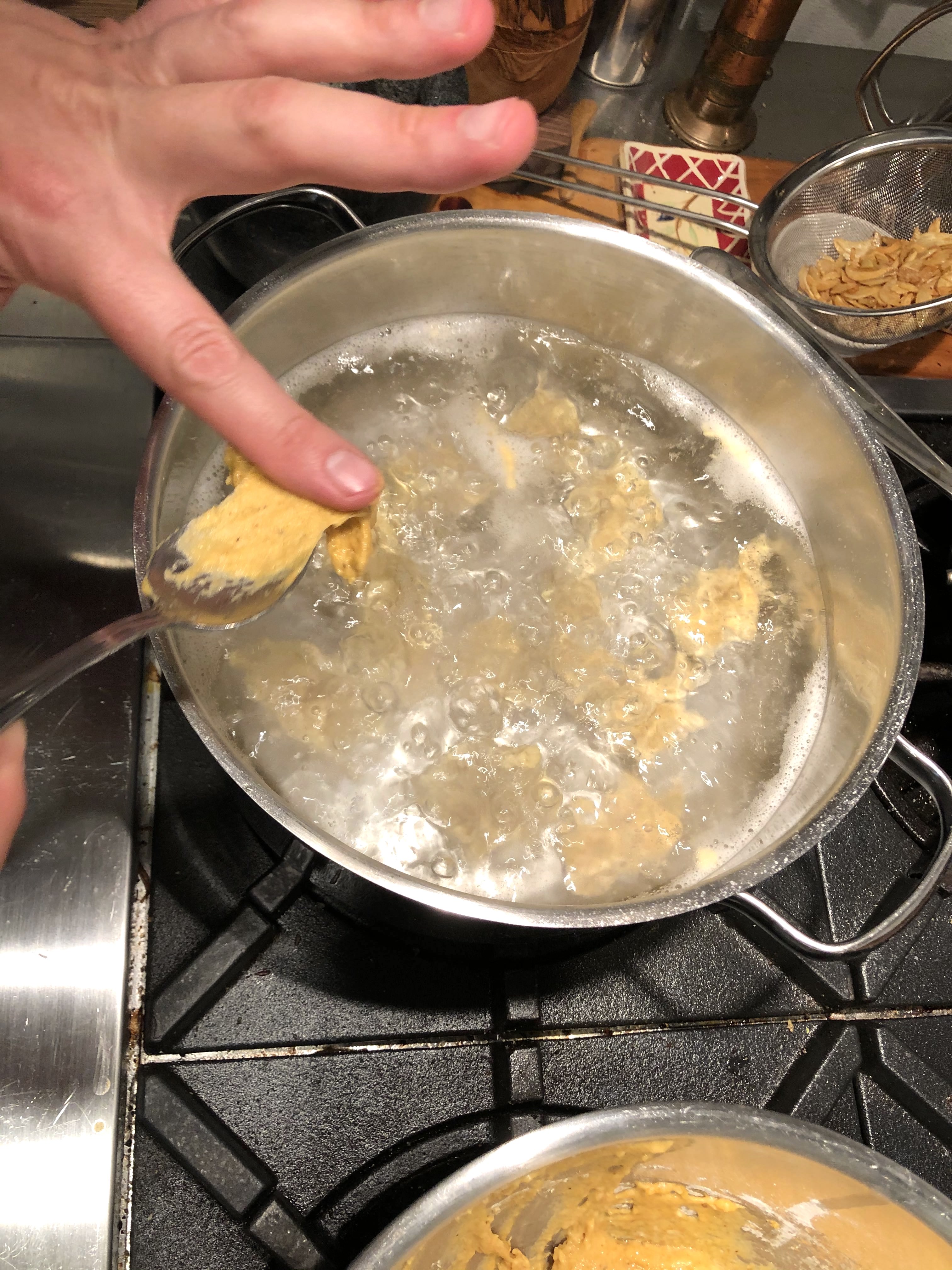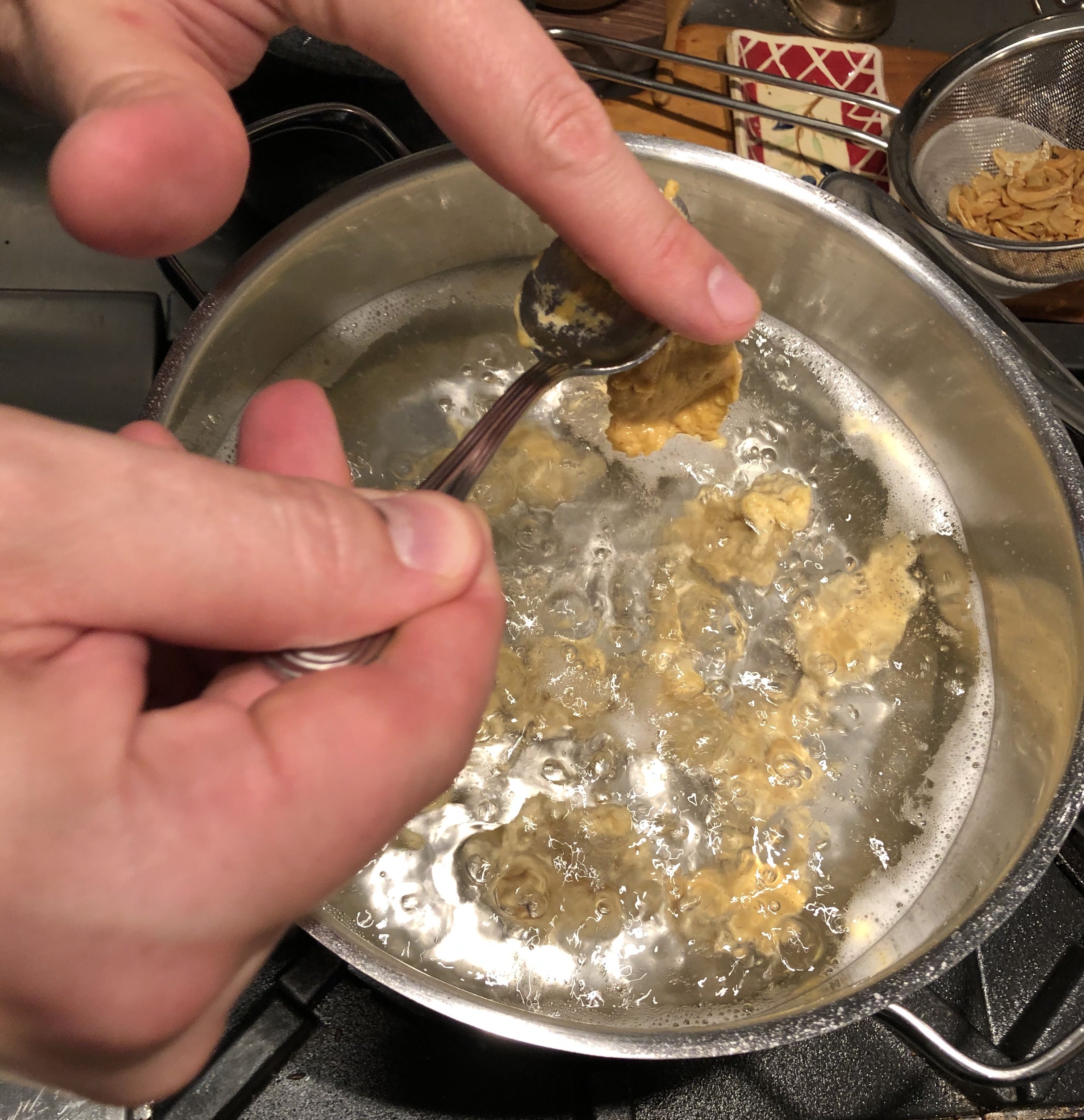 Bring to boil about 2 qt of water seasoned heavily with Kosher Salt (salty as the sea). With a small spoon, slowly push the batter with your finger into the boiling water. You want to cover the bottom of the pot with the dollops (10 - 14). Let them boil for about 4 to 6 minutes, then scoop them out and add them to the Sour Cream, Onion and Chicken Stock mix from above.
