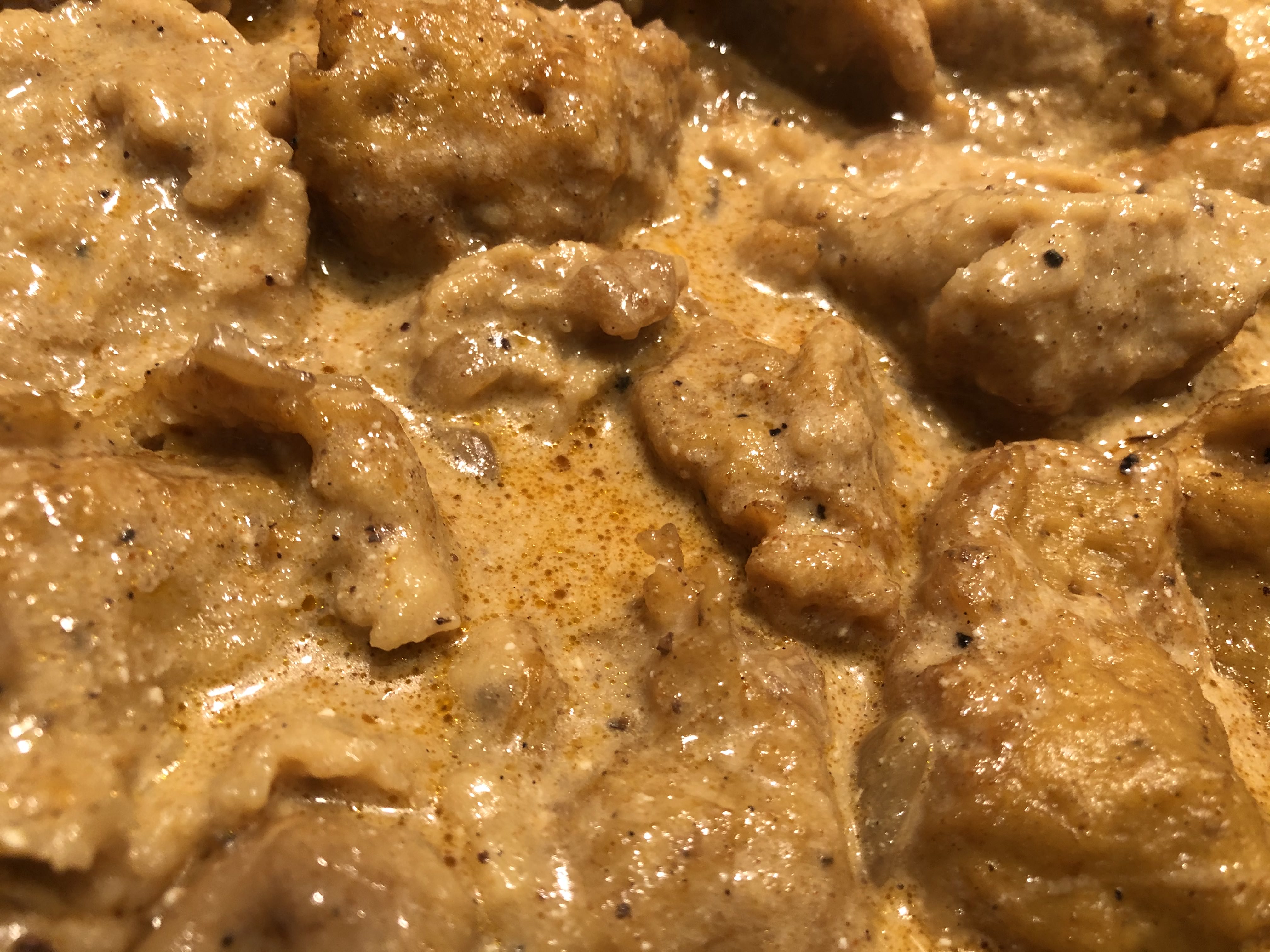 Remove the chicken and reserve for later. Add Sour Cream to Onions and Chicken Stock mixture. Whisk in, do not bring back to a boil (This will cause the mixture to thin out).