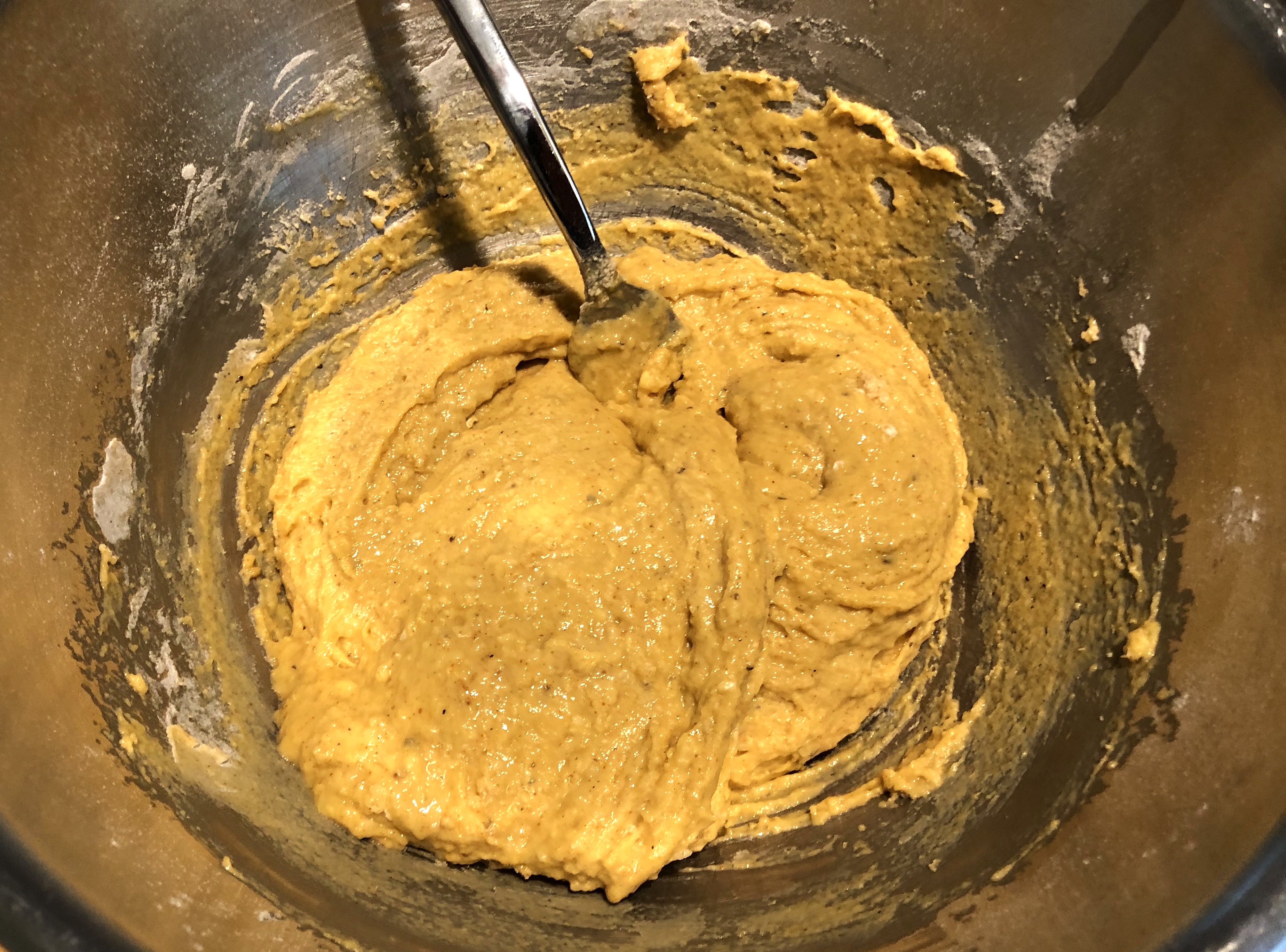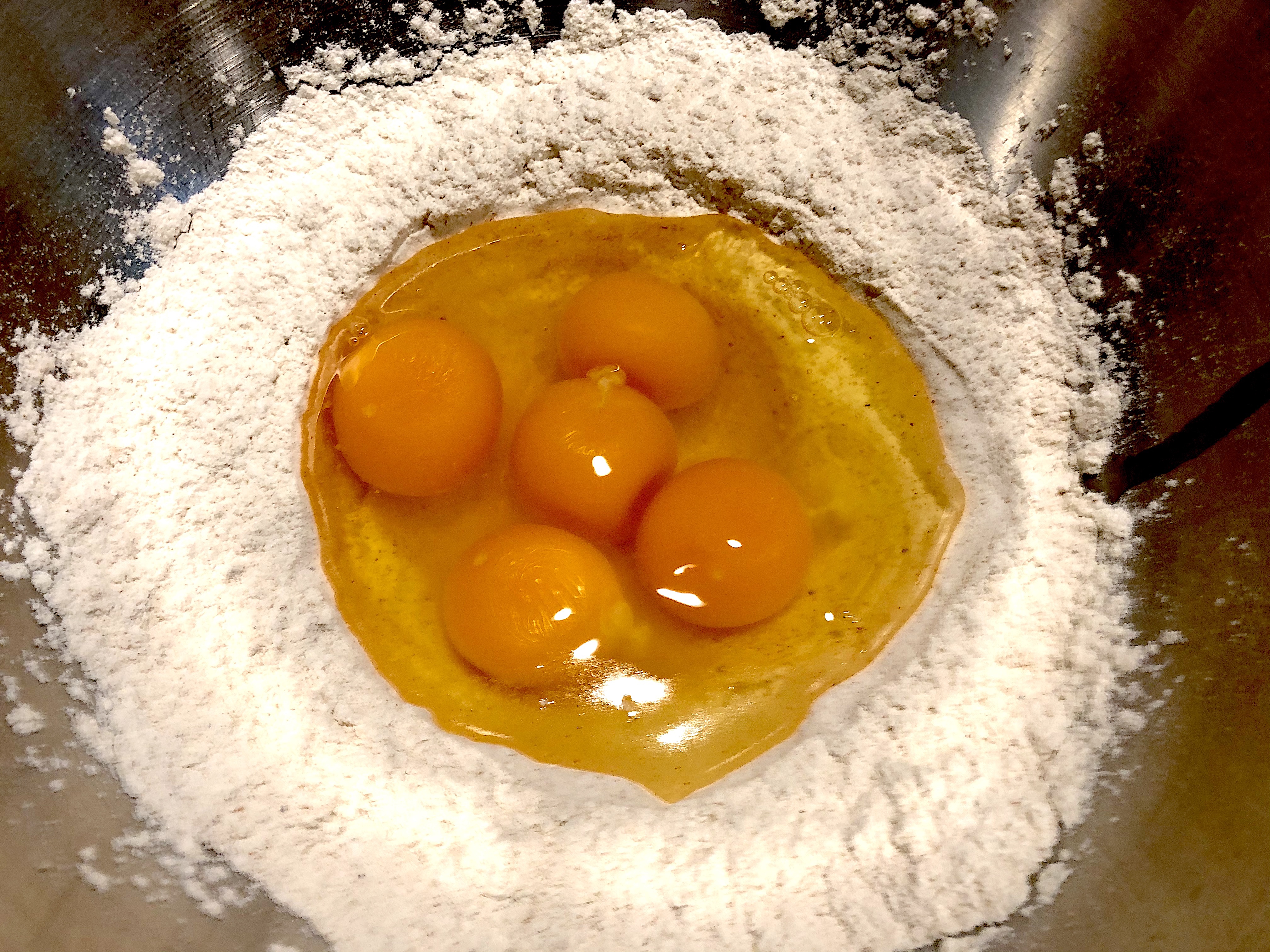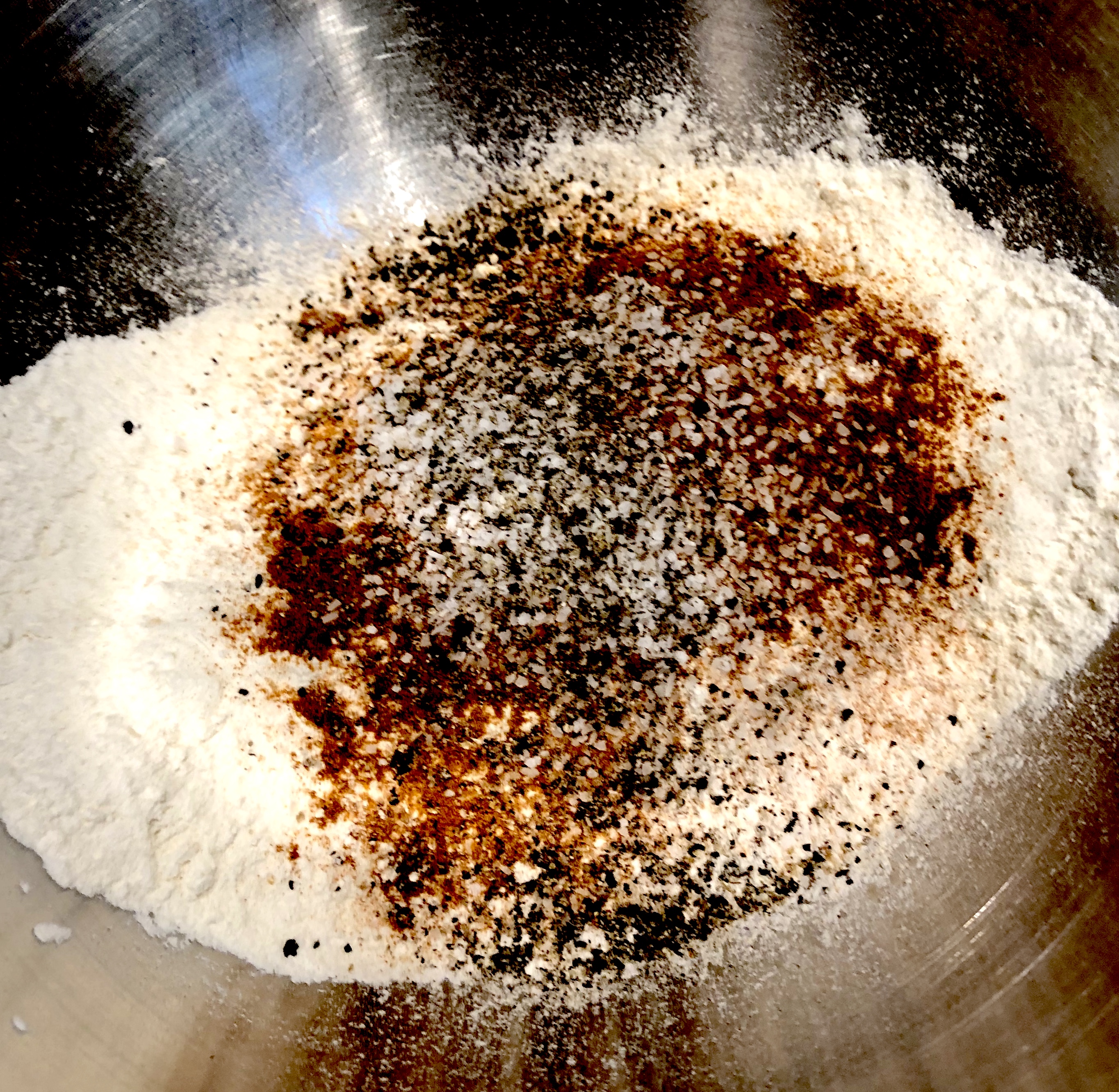 Mix all of the dry ingredients with a fork (Flour, Paprika, Salt, Pepper). Next form a well with the fork. Add the eggs. Stab each yolk (no reason, just fun), then start to whisk with the fork. Slowly start to bring in the flour from the sides a little at a time. As the mixture starts to come together add enough milk to make it not too thick. You want the mixture to be like a very thick batter. I do this whole process from beginning to end with a fork. This is so that I do not over mix.