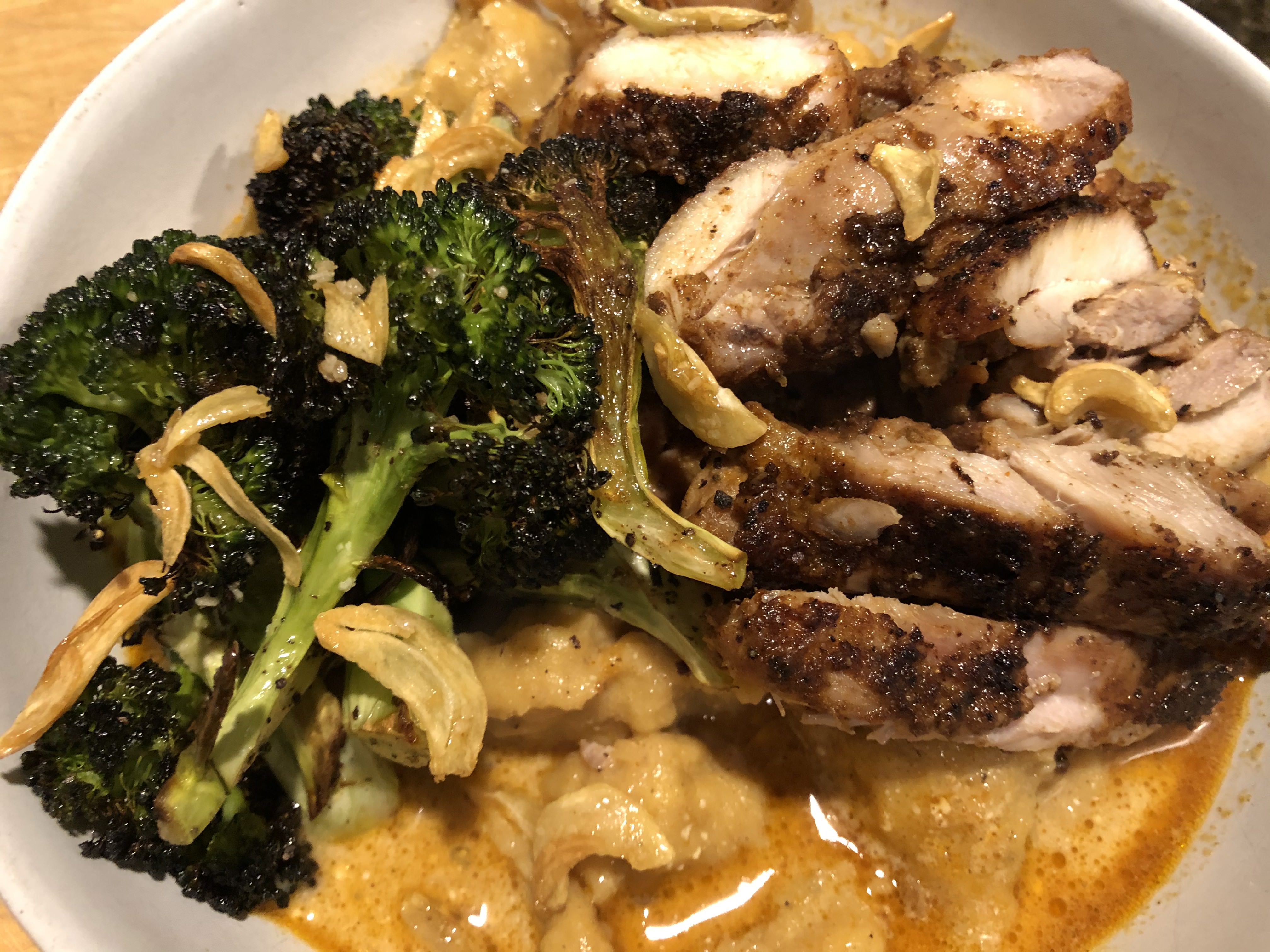 Ladle up a good amount of dumplings and sauce in a bowl. I take the chicken and slice it up. Easier to eat. Lazy I know. Don’t care. Add the chicken right on top of the dumplings. Right next to the chicken, add the crispy broccoli. Top everything with the garlic chips.