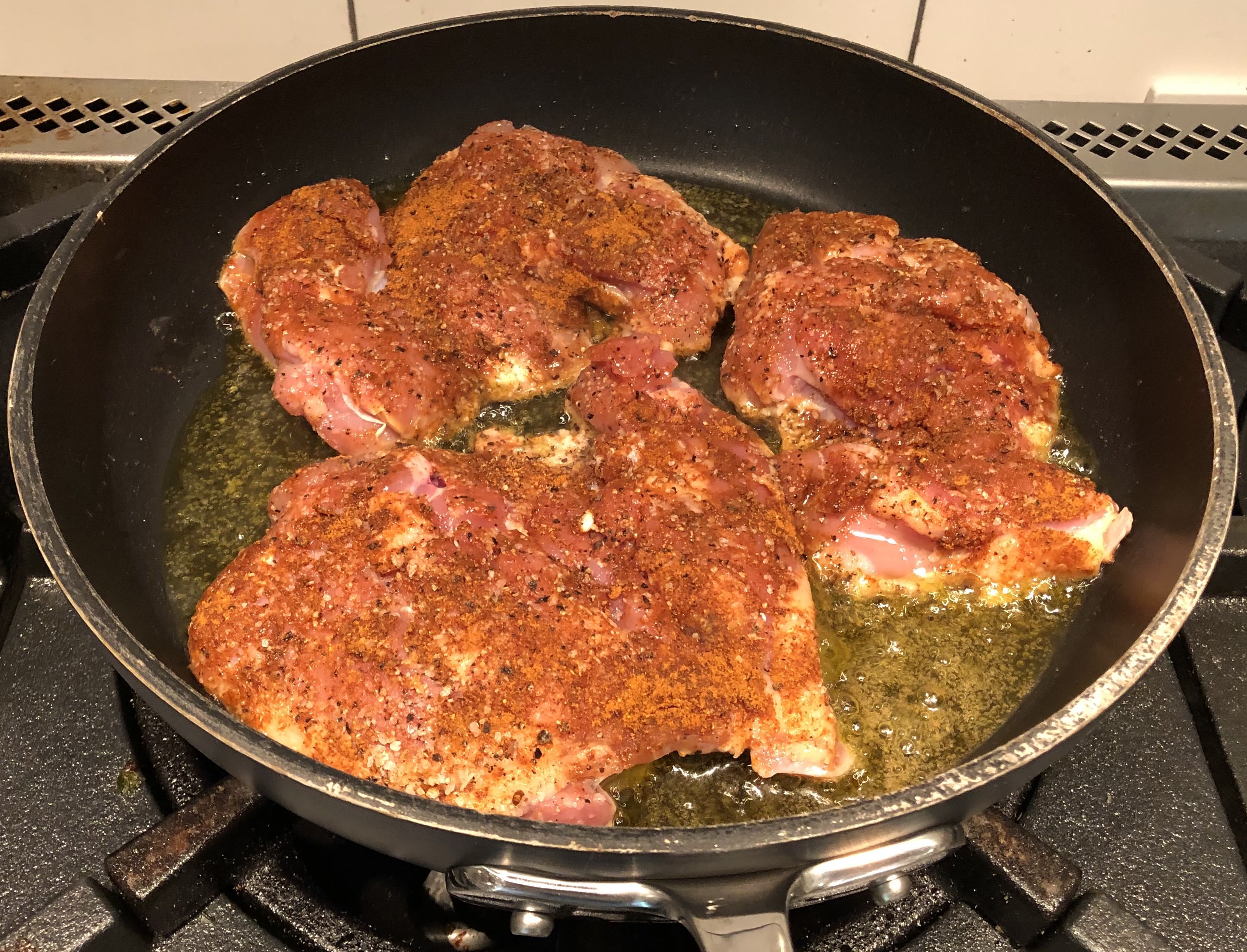 Liberally season chicken thighs with the Paprika, Salt and Pepper on both sides of the chicken. Heat oil to right right before the smoke point. Sear both sides of the chicken. Pull and reserve. You are not cooking the chicken all of the way though just yet. It will still be raw in the middle. Not to worry. If you need to jump ahead to feel better you can (see Chicken Braise).