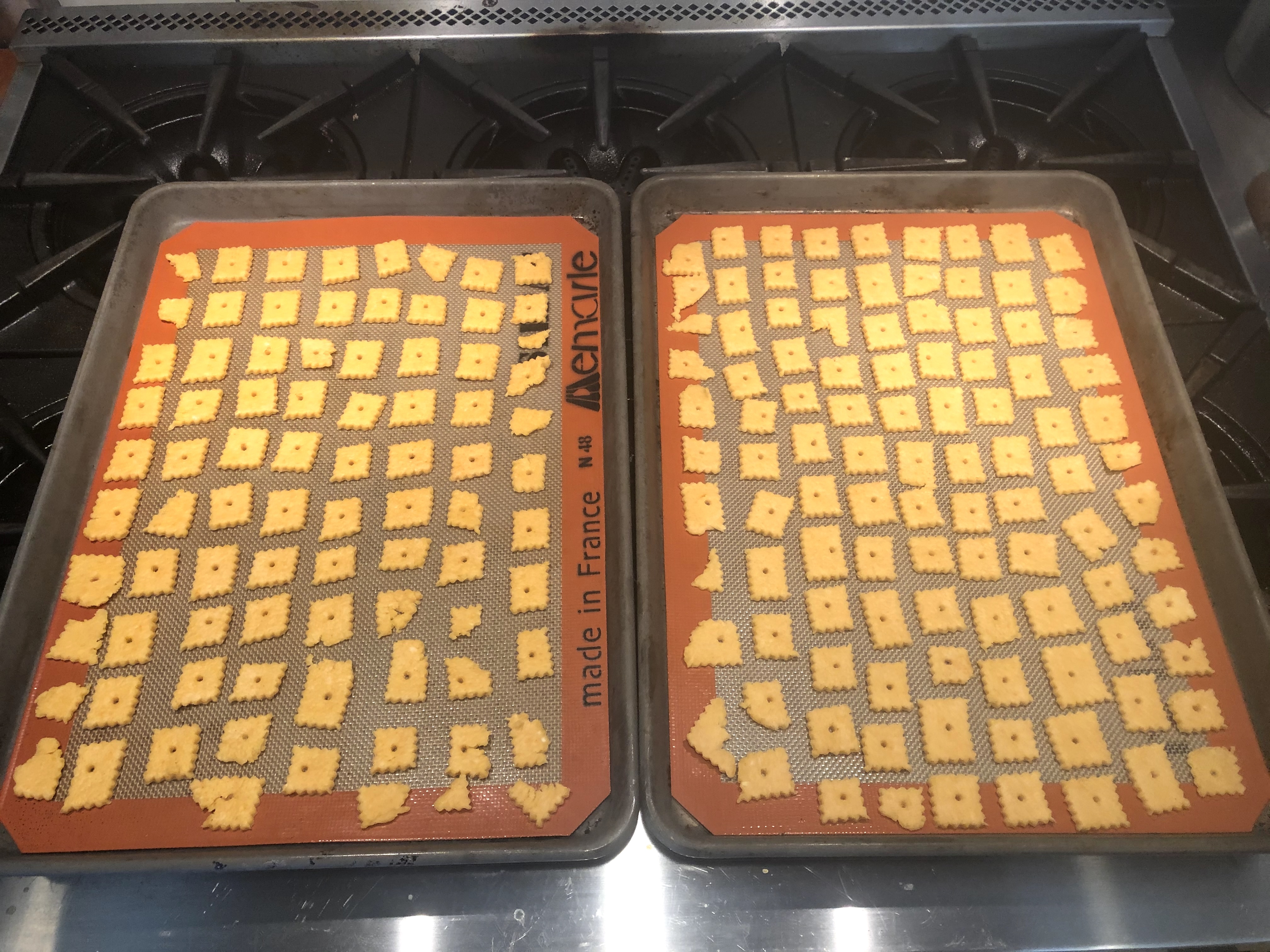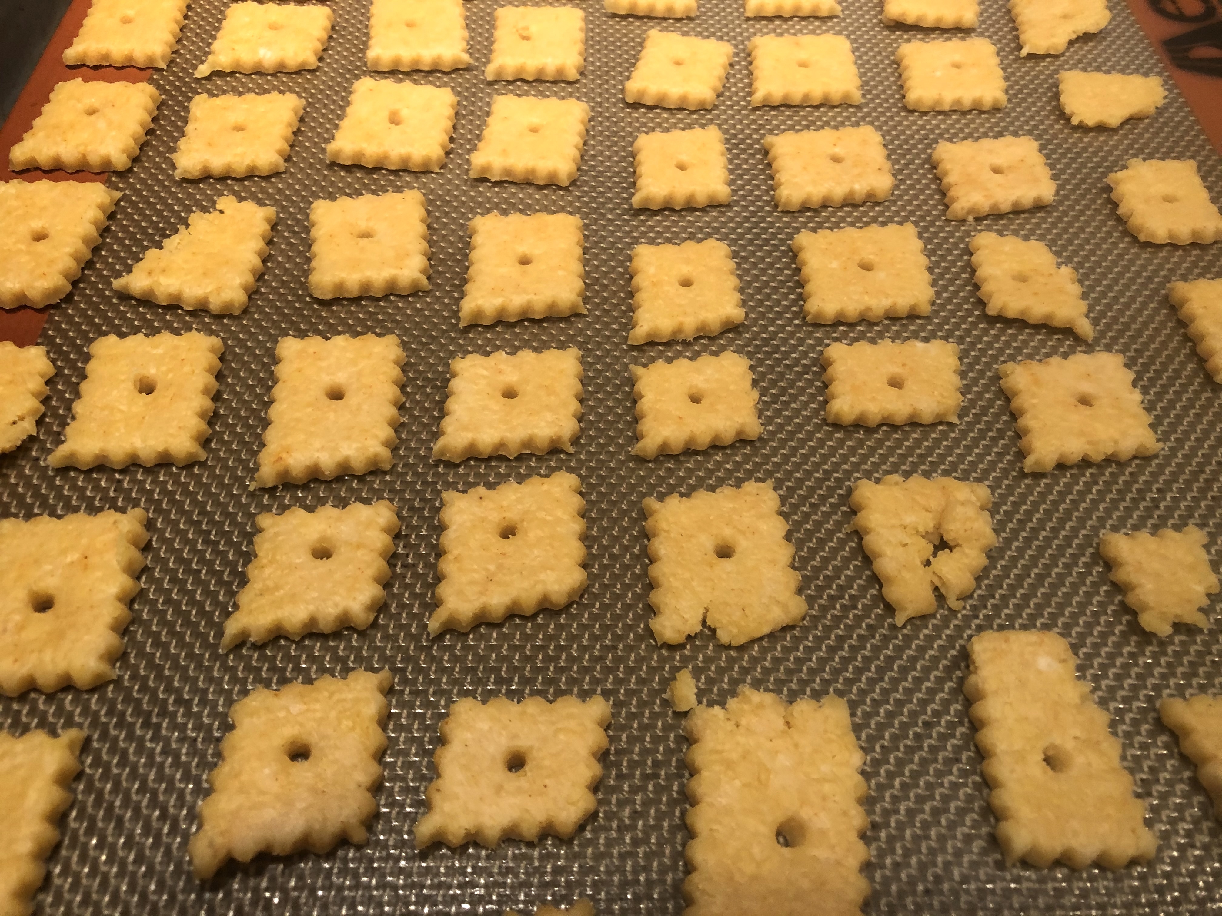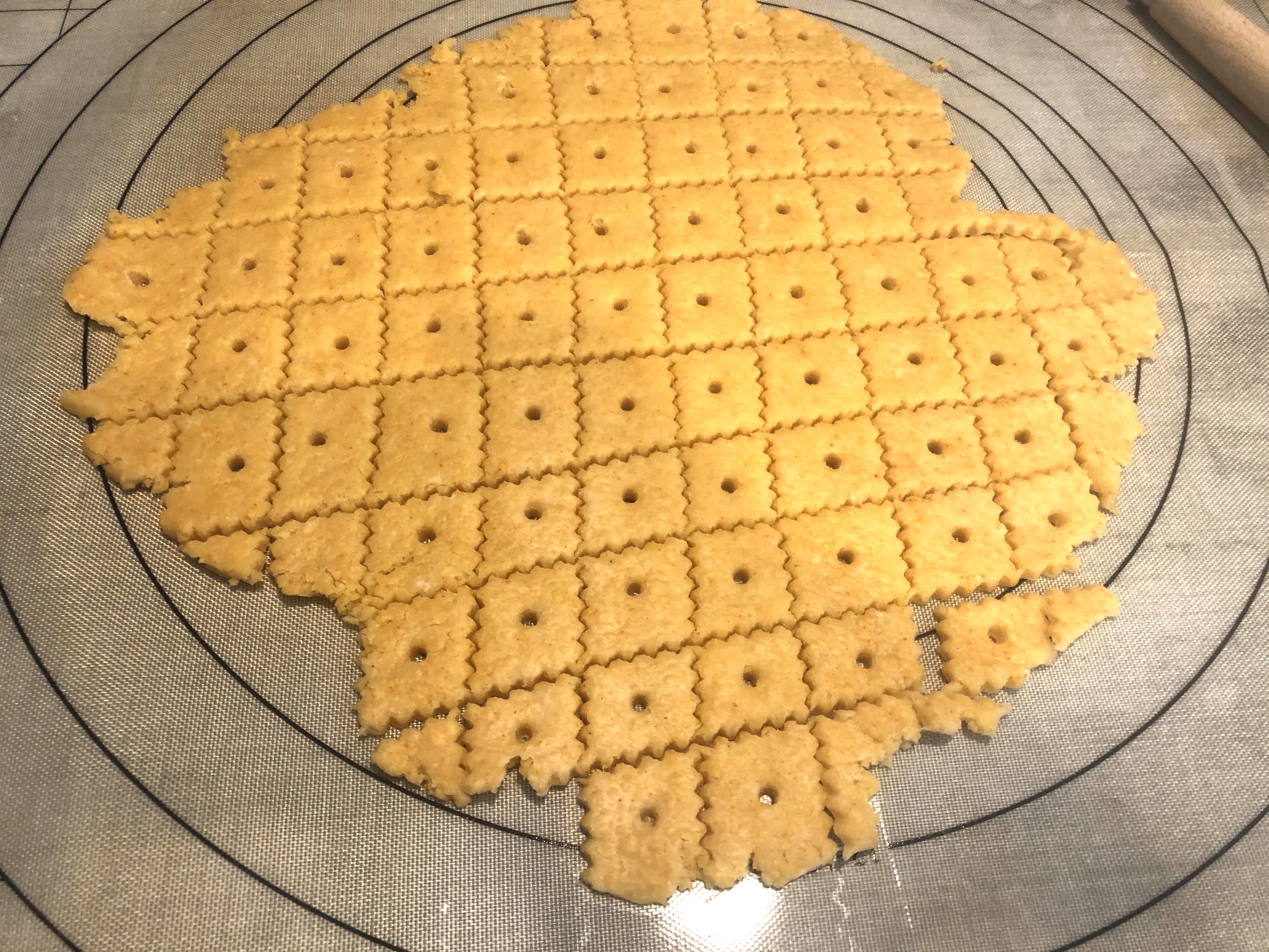 Roll out the dough to 1/4 inch thick. The thinner you get the dough the crispier the cracker will be. I used a pasta cutter to cut the squares. I also used a wooden skewer to make the little hole in the center of each cracker. After the dough is cut and skewered, place the uncooked crackers on a non stick silicone baking mat. You can place them pretty close together. They puff up, but not out. If you have a convection oven I would suggest using it. Cook for 8 minutes then rotate 180 degrees. Then cook for another 5 minutes or until golden brown. The more golden they are the more crunchy they will be.